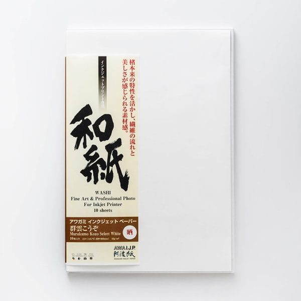 Awagami Murakumo Kozo Select White Paper – A3+ has a weight of 42gsm. It is made of soft sinewy fibres which give the paper an organic charm. Comes in a pack of 10 sheets.