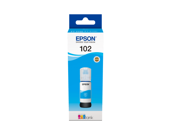 The Epson 102 EcoTank Cyan. Designed for EcoTank. This four-colour dye and pigment ink produces high-quality text.- Re-engineered bottle for mess-free refills.